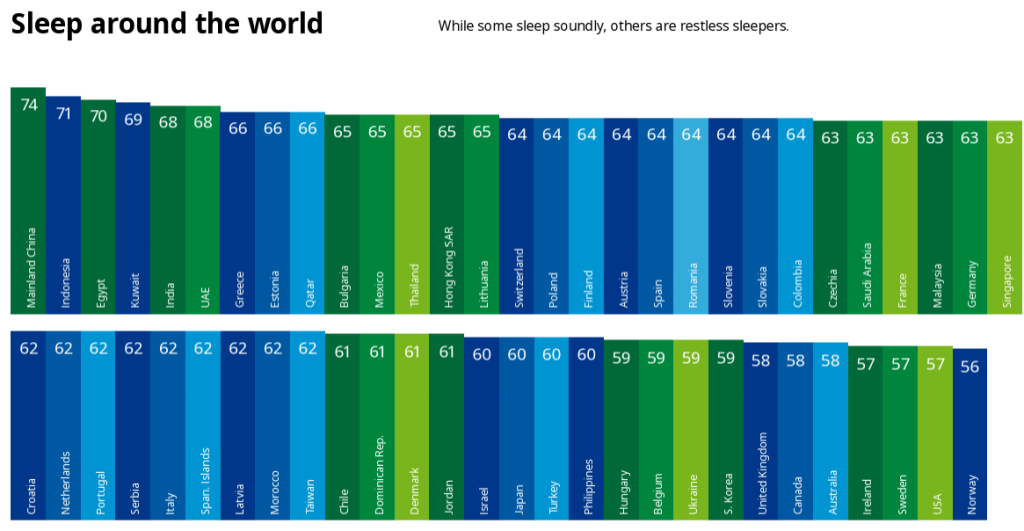 2024 m. rudenį „GlobeScan“ atliktoje tarptautinėje miego įpročių analizėje, kurioje dalyvavo ir daugiau nei tūkstantis Lietuvos gyventojų, aiškiai matyti, kad Lietuva patenka į vidutinio miego kokybės šalių grupę. Tik 65 % respondentų nurodė, jog miega ramiai, o tai reiškia, kad net kas trečias lietuvis susiduria su neramiu ar prastu miegu. Ši statistika signalizuoja apie platesnę problemą, susijusią su kasdieniais įpročiais ir miego aplinka.